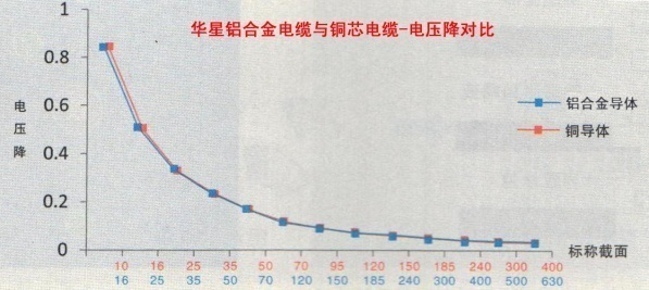 鋁合金電纜和銅芯電纜在同截面同等長度的情況下,其導電率是銅電纜的 61.8%,載流量約為銅電纜的78%,但其質量不到同等電氣性能銅纜的一半。根據電纜截面的規格分布,將鋁合金電纜的截面增大1.5倍左右,載流量與電壓降等電氣參數與銅纜相當,因此在已知銅電纜型號規格的前提下,只需按照7070以下小規格的銅纜對應使用加大一個規格的鋁合金電纜,9595以上直接對應使用加大兩個個規格的鋁合金電纜即可,其電氣性能、機械性能及相應的應用指標與原銅芯電纜設計標準一致,其實際使用性能更優于原有的銅芯電纜設計標準。